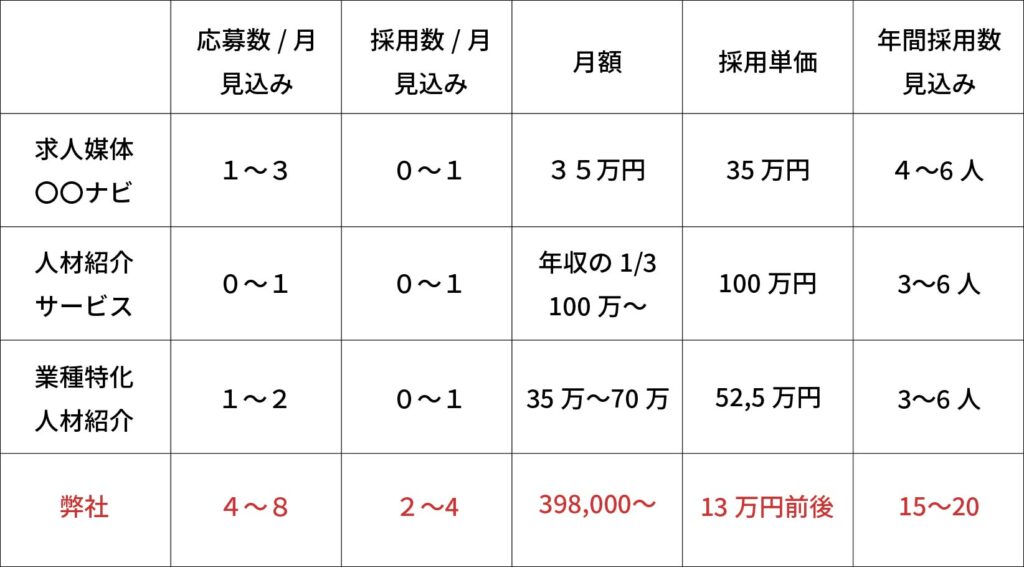 弊社は月額制ですが採用率が高いので他社が人材紹介サービスで1人採用する35万円で約3人ほど採用することができます。そうすれば採用単価は他媒体の約1/3なので圧倒的なコストパフォーマンスが実現できます